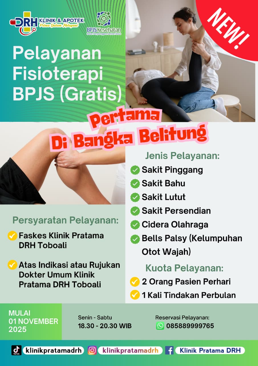 Direktur Klinik Pratama DRH Toboali, dr. Rudi Hartono, M.M., menjelaskan, layanan fisioterapi ini diperuntukkan bagi pasien dengan kondisi seperti sakit pinggang, sakit bahu, sakit lutut, nyeri persendian, cedera akibat olahraga, hingga Bells Palsy atau kelumpuhan otot wajah.