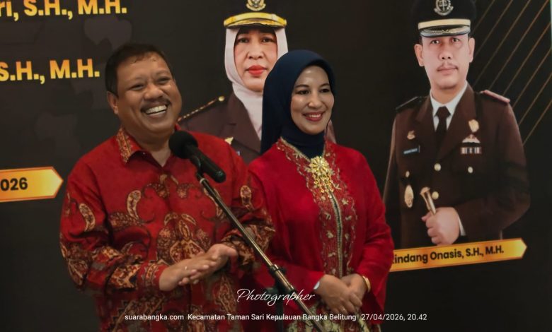 PANGKALPINANG, GARUDAMERDEKA.ID – Wali Kota Pangkalpinang, Prof Saparudin Masyarif didampingi istri tercinta, Bunda Susanti Saparudin, menyampaikan sambutan hangat atas kehadiran Kepala Kejaksaan Negeri (Kajari) Pangkalpinang yang baru, Rindang Onasis, dalam acara malam ramah tamah dan serah terima jabatan yang digelar di rumah dinas residen Wali Kota Pangkalpinang, Senin (27/4/2026) malam.